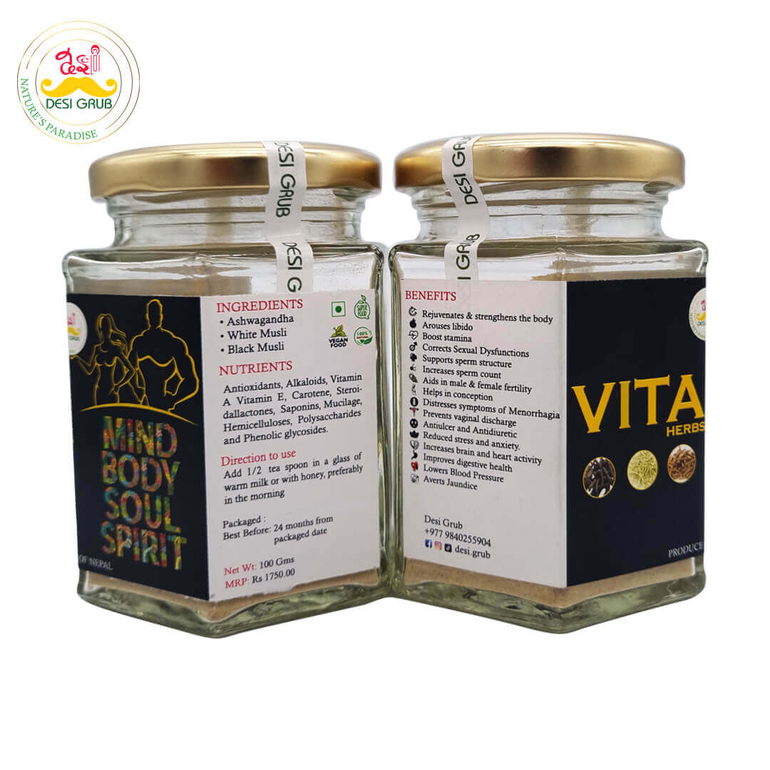 Desi Grub Vita Herbs is a natural herbal product that harnesses the power of three potent herbs: Winter Cherry (Ashwagandha), Chlorophytum borivilianum (Safed Musli), and Curculigo orchioide (Kali Musli). This carefully crafted blend offers a holistic approach to health, promoting vitality, resilience, and overall well-being. With Vita Herbs, embrace nature’s gift to unlock your full potential and thrive in mind, body, and spirit.